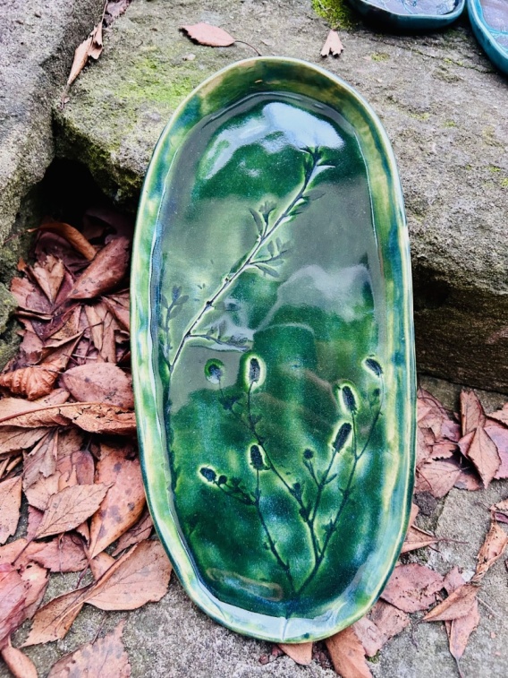 Talerz duży podłużny Zielony z roślinami